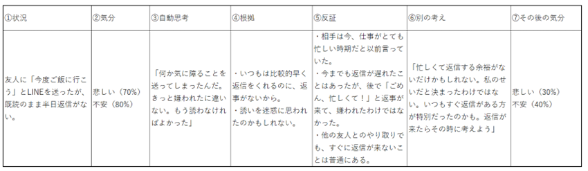 このように、書き出して客観視することで、「嫌われたに違いない」という一つの考えに固執していた状態から、「忙しいだけかもしれない」という別の可能性に気づき、不安が和らいでいるのが分かります。